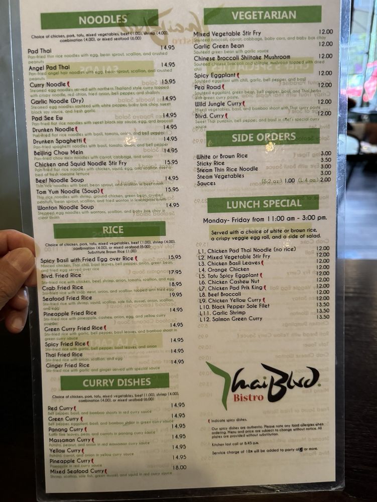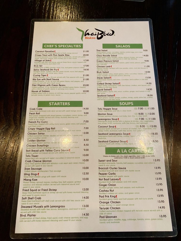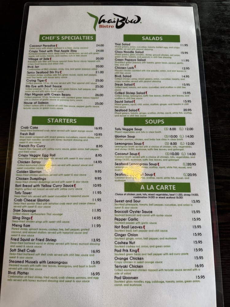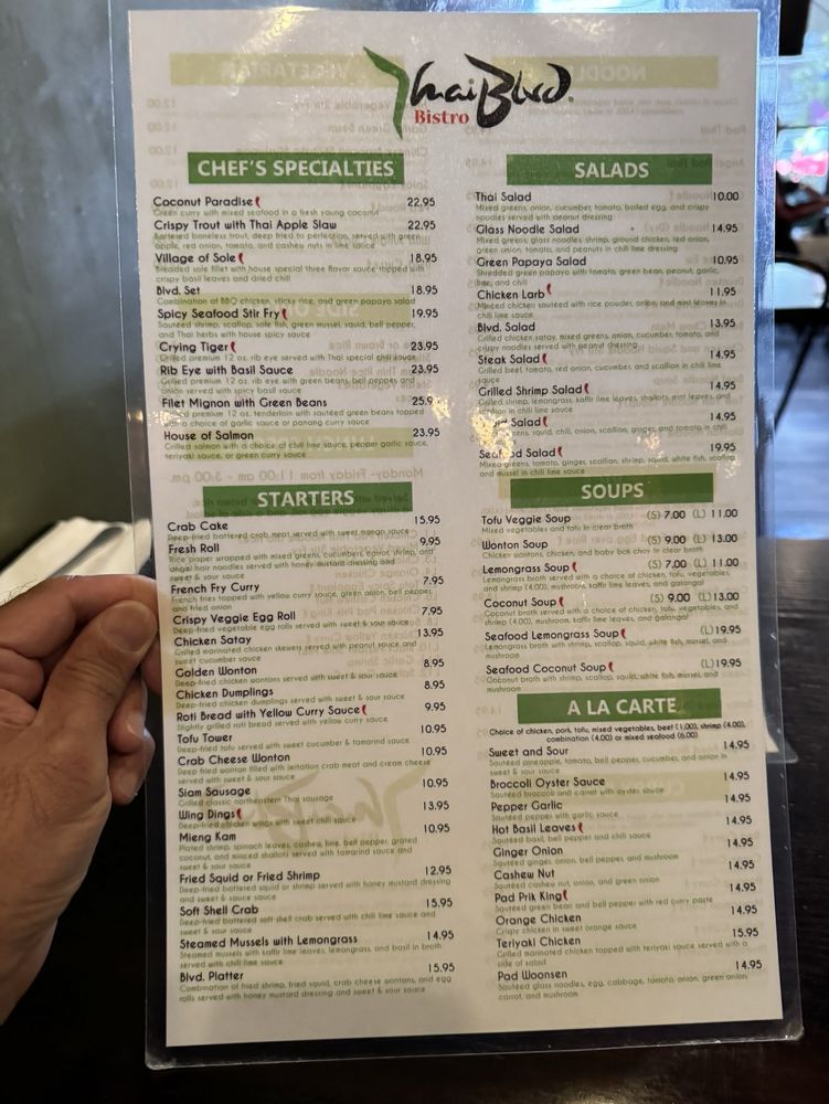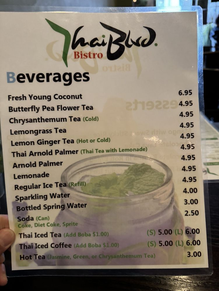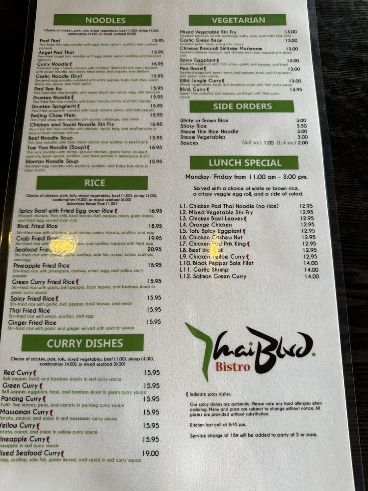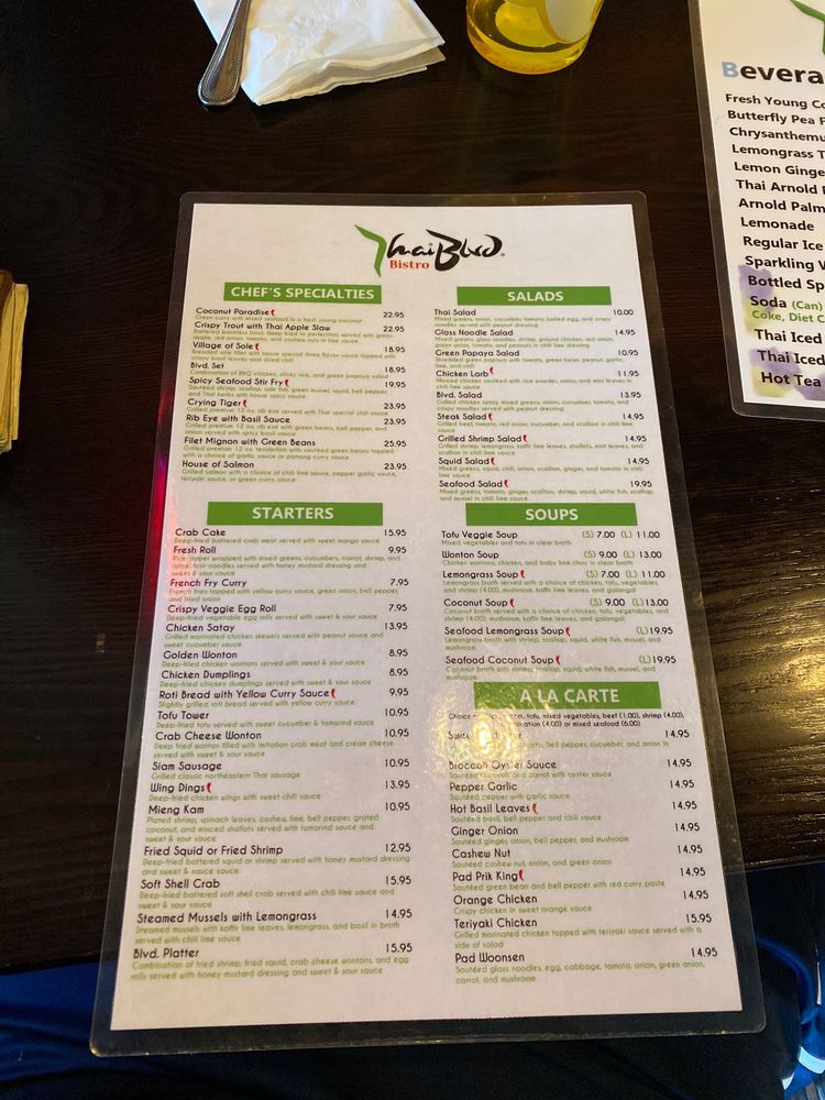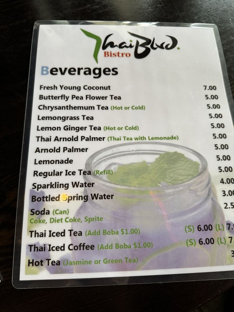 Introducing the menu at Thai Blvd Bistro, a hidden gem in Canoga Park. The bistro offers a variety of starters like fresh rolls, crispy veggie egg rolls, and chicken satay. For soup lovers, options include wonton soup, lemongrass soup, and coconut soup with various protein choices. The beverage selection features refreshing options like Thai iced tea, lemon ginger tea, and butterfly pea flower tea. Customers rave about the flavorful dishes, generous portions, and friendly service. The cozy ambiance, delicious food cooked with love, and quality ingredients make this family-owned restaurant stand out. Don't miss trying their coconut soup and pad Thai, which receive high praise from patrons. Thai Blvd Bistro is a must-visit for those craving authentic Thai cuisine in a charming setting.